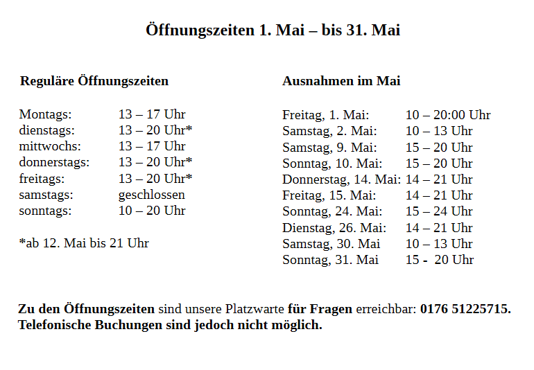 Ca. eine Woche vorher werden die bestehenden Accounts im Buchungssystem freigeschaltet. Alle bereits erworbenen Tickets haben ihre Gültigkeit behalten. Ab dann können sich auch neue Spieler/innen im Buchungssystem registrieren.